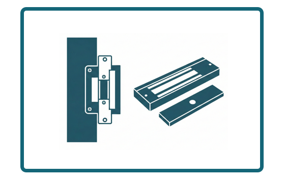 Dispositivo que mantém a porta fechada através de força magnética. Requer alimentação contínua para manter a porta trancada.